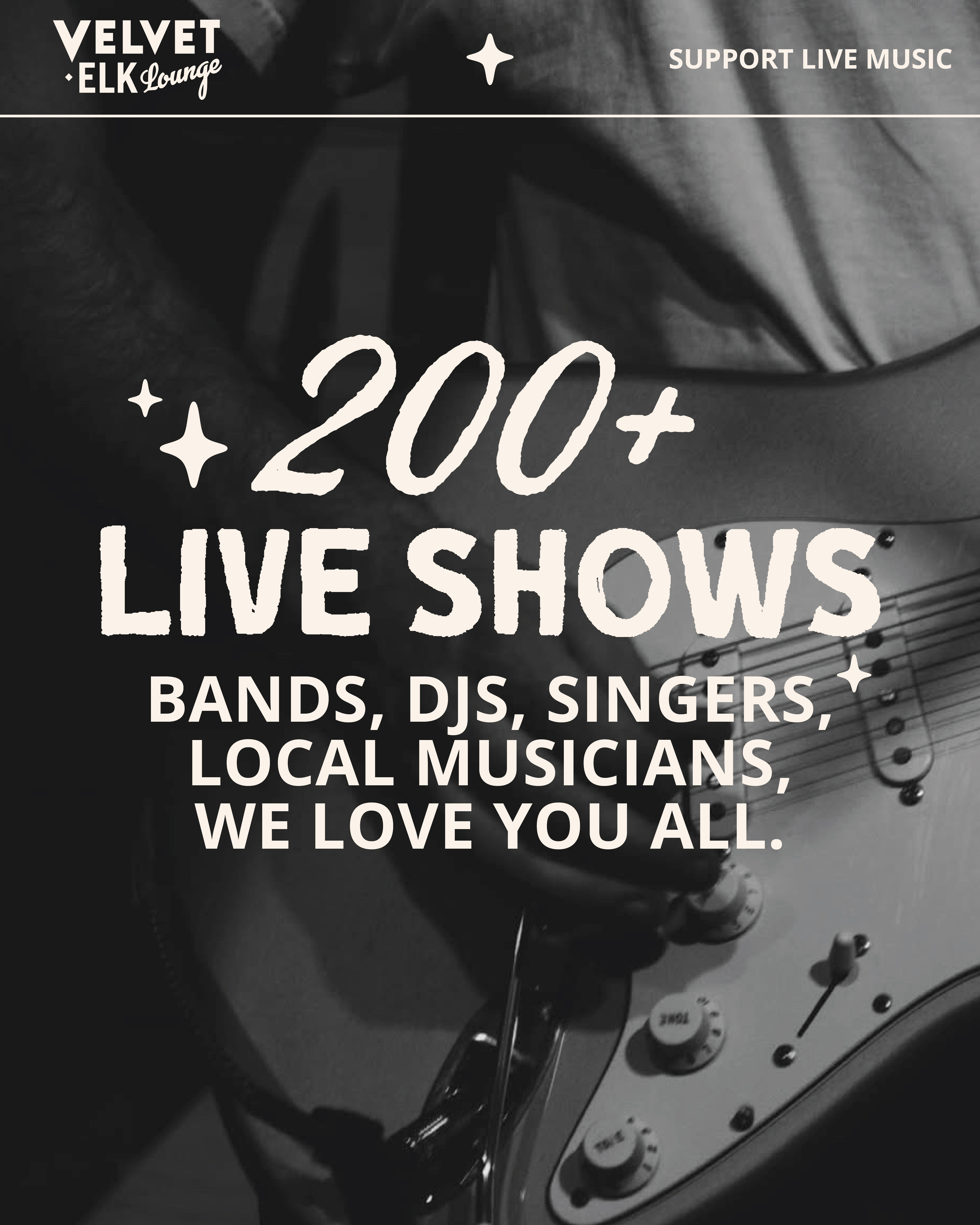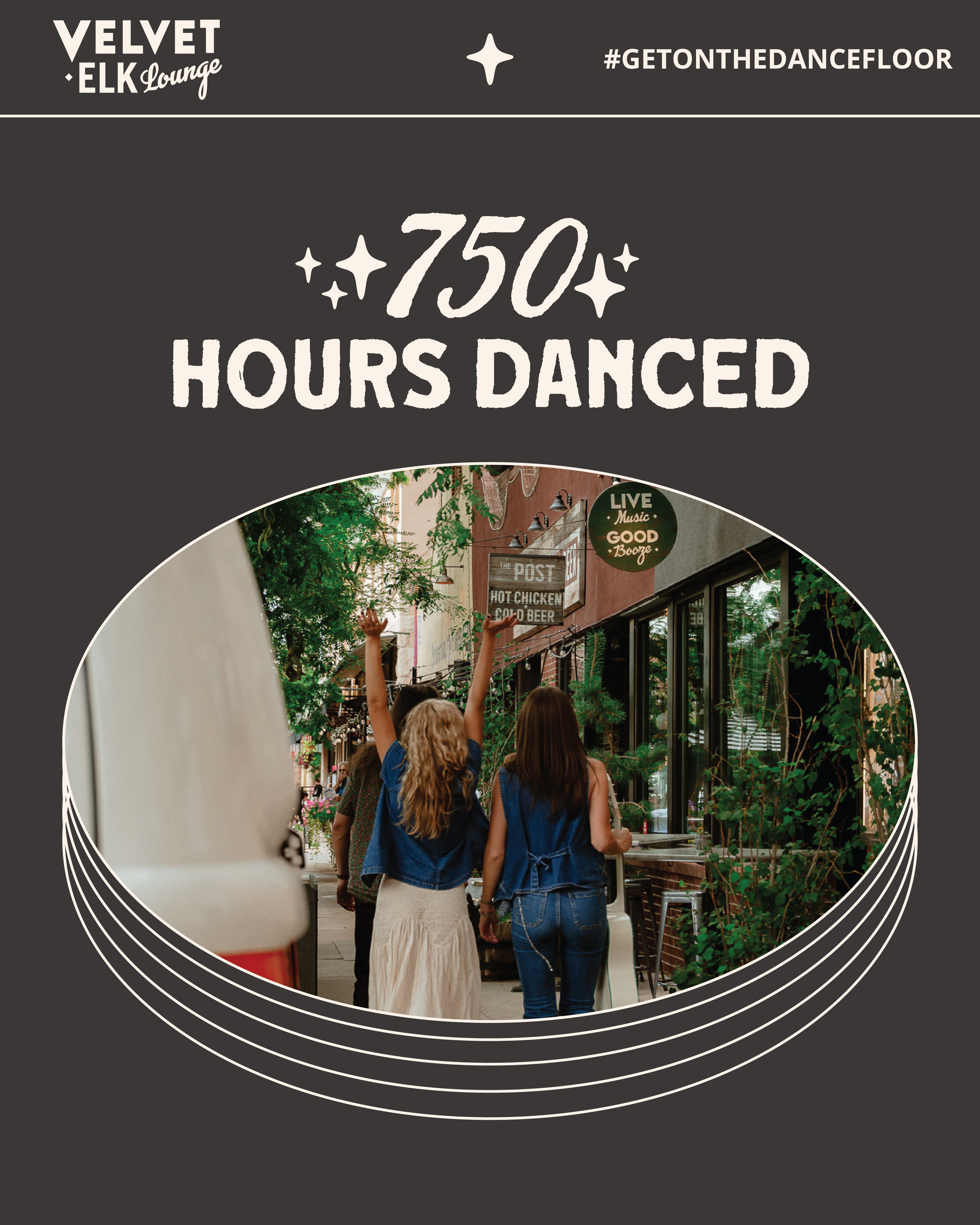 2025 was a landmark year for the Velvet Elk Lounge! From local legends to touring favorites, the Velvet Elk stage stayed hot every single week. Last year you danced for 717 hours. This year? Close to 800 HOURS spent groovin' on the VEL dance floor at 200+ live shows.